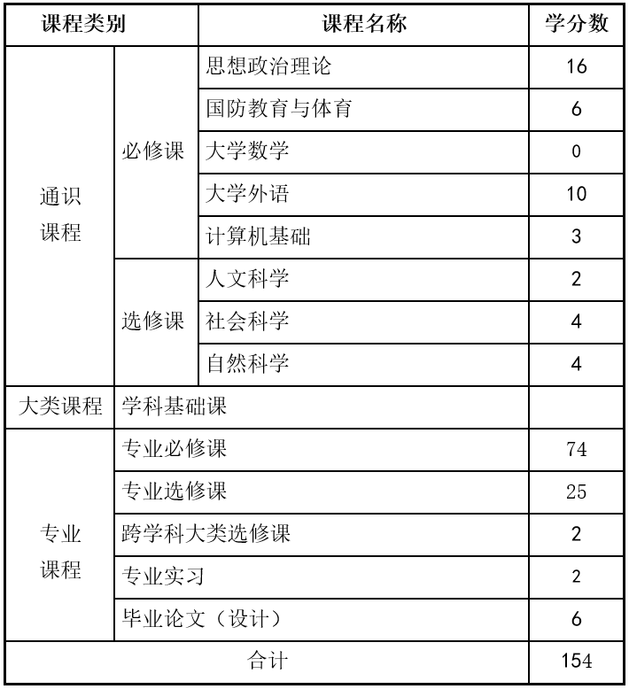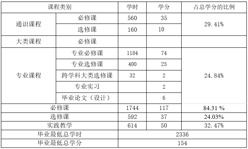 本专业毕业最低总学分154学分,总学时2336学时;其中必修课程 117学分,占84.31 %;选修课程37学分,占24.03 %;实践教学50学分,占32.47 %。
