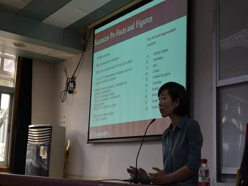 刘华胤老师首先向我们介绍了巴黎政治大学(以下简称“巴政”)的教学特点。巴政采取的是高度交叉的多学科教学,旨在培养全球化所需的复合知识型未来决策人才。巴政注重研究,目前已有12个领先的人文科学研究中心。全校40%的学生为国际学生,来自世界130多个不同国家和地区,同时巴政拥有超过350个遍布全球的合作伙伴大学:如哥伦比亚大学,哈佛大学,普林斯顿大学,伦敦政治经济金宝博