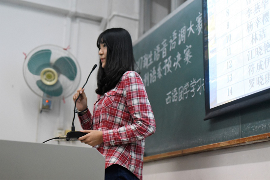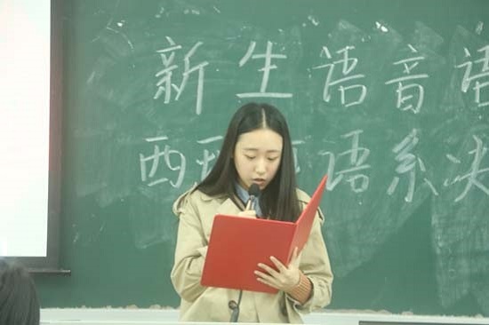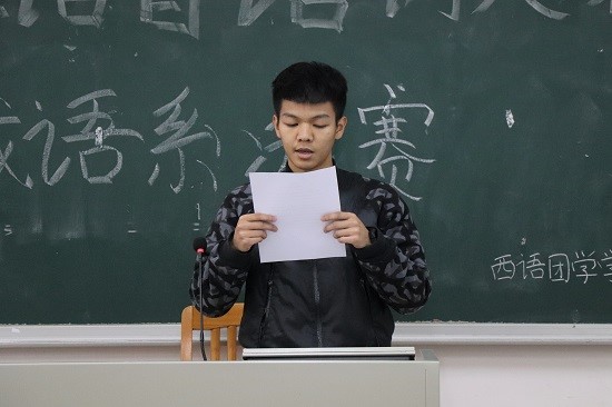 新生语音语调大赛之西班牙语系决赛于11月23日下午17:30分在第六教学楼B211室举行,由西班牙语系张梦璐老师、刘柳老师和外教Eva担任评委,由西班牙语1602班倪士鸿和郑炜莹双语主持。