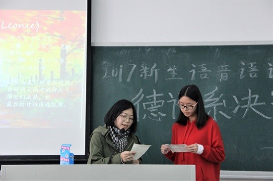 11月23日,新生语音语调大赛之德语系决赛在北六教B207顺利举行,23名选手在之前的预赛中脱颖而出,顺利晋级决赛。出席本次比赛的评委是林璐老师和德语系外教Anja Döscher。