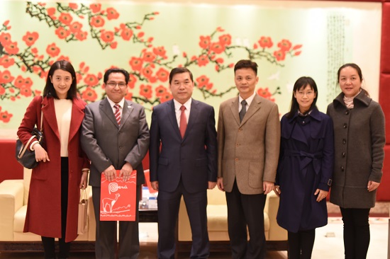 的西班牙语专业能得到长足发展,有所突破。对此,David先生回应道,他认为如今越来越多的秘鲁人有兴趣学习中文,中秘两国关系紧密,中华文化在秘鲁影响深远。他对于焦副校长提出的加强联系合作表示了认同。同时他也指出,中秘两国间除了互派留学生以外还能够有更多合作推进。焦副校长对David先生的提议表示了充分认可,并鼓励两国学者共同合作开展研究项目。会议最后,双方合照并且交换了礼物,金宝博