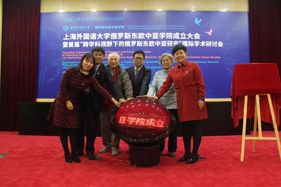 此次研讨会正式召开当天,上海外国语大学俄罗斯东欧中亚学院揭牌成立,成立大会上,广外金宝博