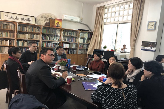 当天下午,刘齐生教授、德语系主任卢铭君教授、助理黄羽欢博士、参与DLL课程教学的德语系教师与歌德学院代表们展开了会谈,对DLL项目的实施进行了总结,并签署了课程的管理文件。歌德学院对德语系课程的开展情况给予了高度肯定,希望德语系能够向其他有意开设DLL课程的院校传授经验。德语系对歌德学院长期以来的支持表示衷心的感谢,也表示希望中德双方在该项目上能够继续保持良好的合作关系并期待未来能有更多的合作。