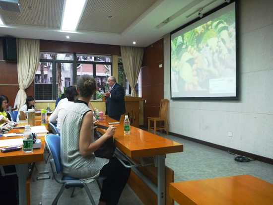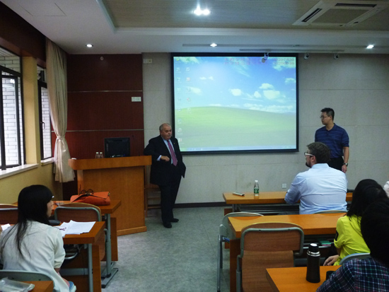 乔瓦尼·穆萨吉先生首先播放了一段描写西西里风土人情的视频,让学生们从意大利的著名城市西西里开始了解意大利的独特性与创造力。接着向大家介绍具有这两种特色的闻名世界的意大利时装。他详细介绍到,意大利服装注重灵感与自由,以设计的观念与想法为主,通过服装向大家展示设计师及意大利人的想法。意大利时装重视衣服设计与制造的每一个细节。乔瓦尼·穆萨吉先生以衣服的扣子为例,他说以前扣子是一个人身份的体现,所以意大利人在设计与制造服装的时候会注重每一颗扣子的设计与做工,这谨慎的做法也是意大利时装得以享誉世界的重要原因之一。乔瓦尼·穆萨吉先生还将中国服装与意大利服装进行对比,向大家分析各自的利与弊,表示双方是互相学习的关系,以后应该互相合作,互相进步。