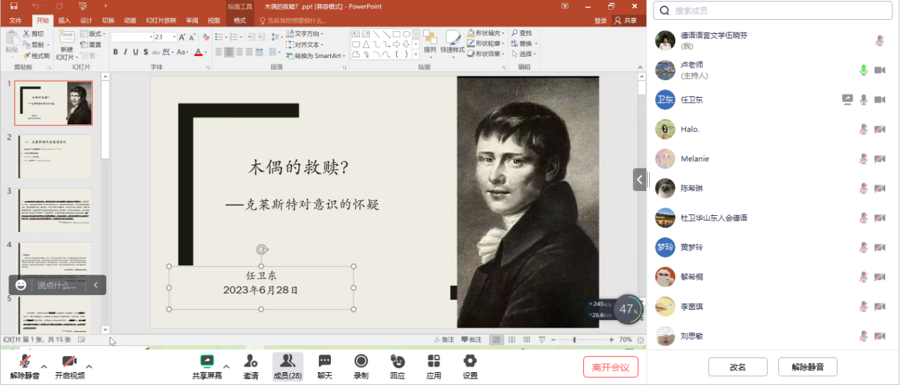 在线上开展了德语系实践周学术讲座,北京外国语大学任卫东教授应邀开展了一场题为《木偶的救赎---克莱斯特对意识的怀疑》的学术讲座。讲座由金宝博