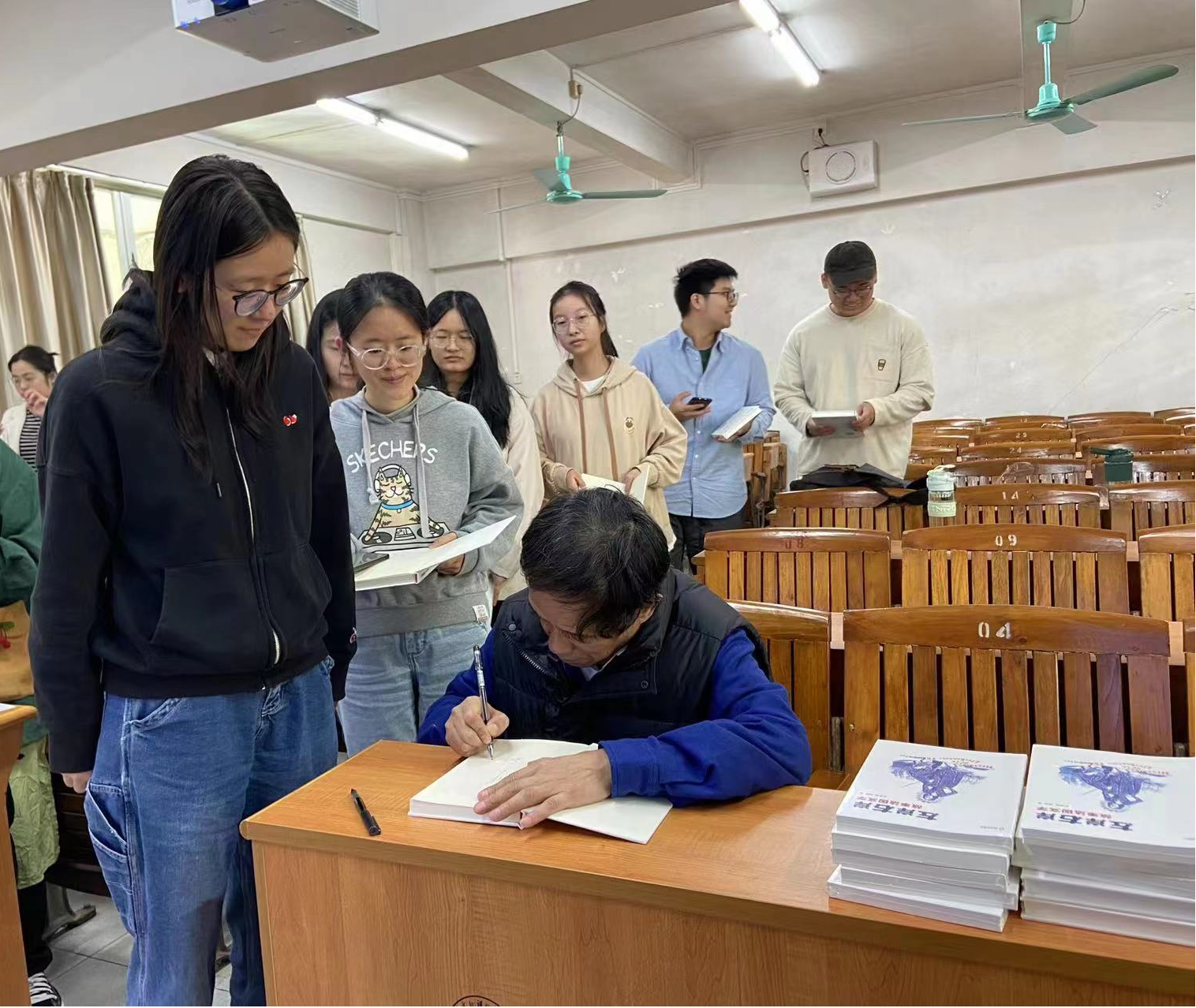 课间休息时,杜青钢教授向参会学生赠送了自己的著作《左岸右岸:故事法国文学》,并逐一签名留念。