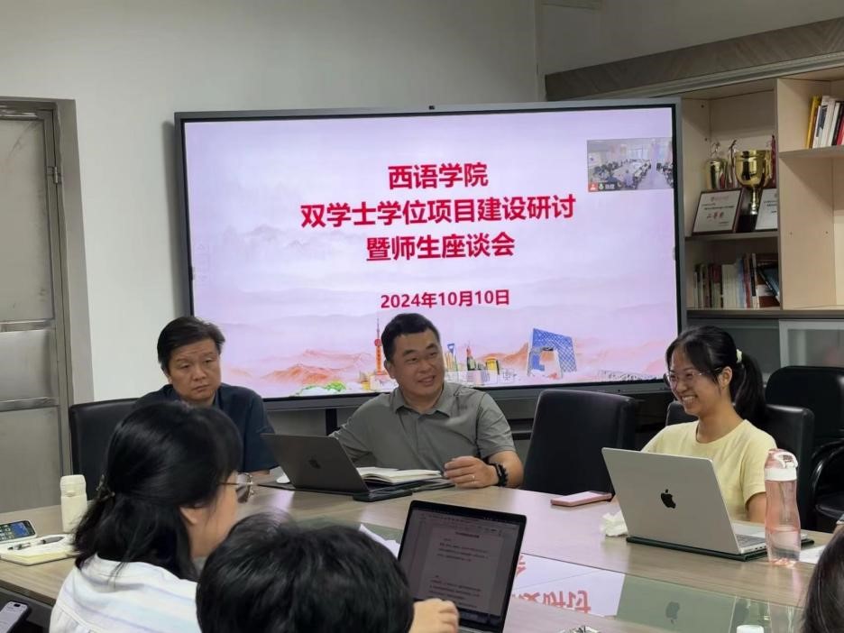 国际贸易系系主任田云华,法语系主任叶剑如、德语系主任助理张思源、西班牙语系主任吴凡、俄语系主任陈欢、意大利语系主任张海虹、葡萄牙语系主任助理杨菁,教务办公室老师以及数名西语2024级双学士学位班级学生代表。本次会议以双学士学位项目的建设研讨,就学生提出的关于学习方面的问题、建议以及未来规划上的疑惑展开讨论,各领导老师给出了一些建议并对同学们作出了殷切希望。