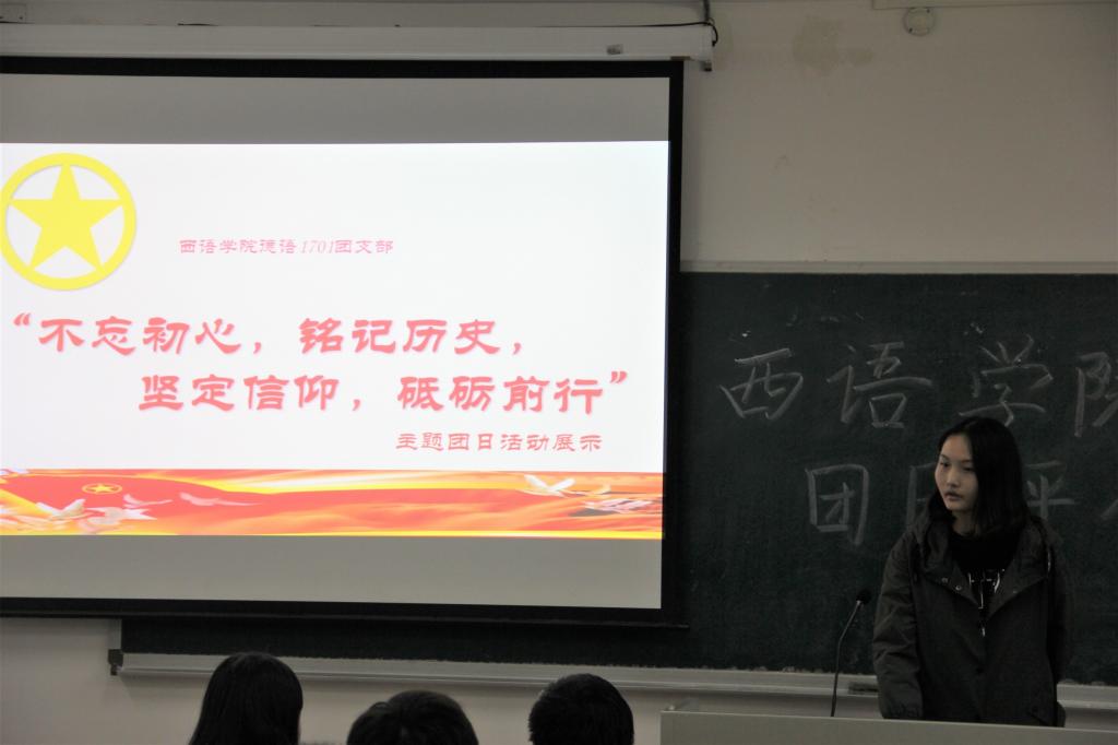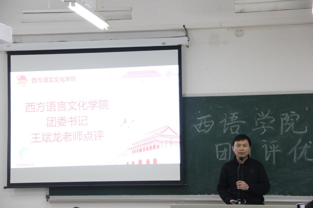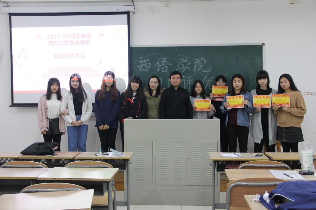 2017-2018年度团日评优大会于第六教学楼B211召开。本次大会由西语团学组织部主持,我院团委书记王斌龙老师、辅导员张悦欢老师、团委副书记李依静、学生会主席何诗琪、副主席曹娉彬、副主席赖怡文、东语金宝博