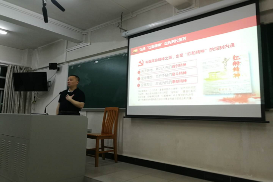 党委书记方华作了题为“红船精神,代代相传”的授课。他从2017年党的十九大闭幕仅一周,习近平总书记带领新一届中共中央政治局常委专程前往上海和浙江嘉兴,瞻仰中共一大会址和嘉兴红船,回顾建党历史,重温入党誓词,宣示新一届党中央领导集体的坚定政治信念讲起,谈到红船精神所昭示的是永不褪色的精神丰碑。重温红船精神,坚定理想信念,进一步推动党的十九大精神学习宣传贯彻,为实现党的十九大提出的奋斗目标、实现中华民族伟大复兴的中国梦提供强大精神动力。