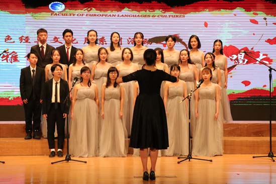 意大利语1701表演的曲目是《国家》。他们真挚的情感、卓越的表现让现场每一位观众为之动容。欣赏完德语1702的“中国风”歌曲《长城谣》后,观众们又领略了俄语1701《夜晚闲逛》展现的异国风采。紧接着,西班牙语1701及葡萄牙语1701分别演绎的《保卫黄河》及《映山红》,让观众回到了战火纷飞的年代,真切地感受到革命不易。革命不易,美好的情谊也可贵。尔后,意大利语1501的《我喜欢》与德语1501&1502的《友谊地久天长》就为现场营造了轻松而美好的氛围。