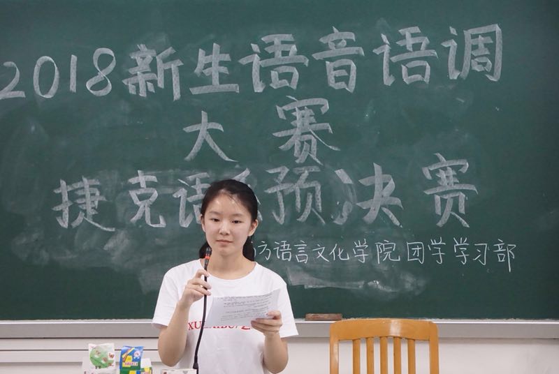 2018年11月15日下午4点, 捷克语系大一新生语音语调大赛预决赛在二教230教室举行。出席本次比赛的评委有捷克语老师蔡洪召,外教Helena以及Hana。捷克语专业是本校今年新增专业,可以说同学们对本次大赛都翘首以待,跃跃欲试。