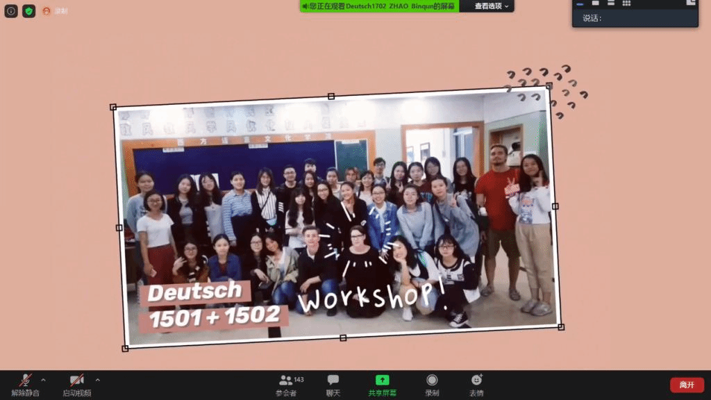 欢送会在离别的不舍和对未来的期望中落下帷幕。在这个特殊的2020年,德语系的老师同学们“云”告别彼此,即使不能相见,但对彼此的祝福仍然饱含深情。
