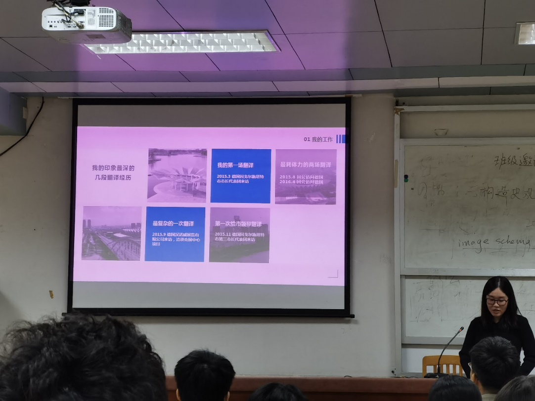首先由杜翰校友介绍了佛山中德工业服务区的基本概况和服务区管理委员会的基本工作内容,讲述了她在工作期间的几段印象深刻的翻译经历,为对政府部门工作感兴趣的同学提供了值得关注的职业方向和选择。