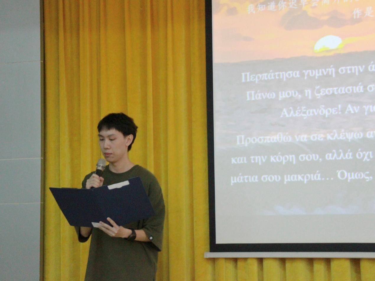 第十一位登场的选手是希腊语2101班文子诵。他朗诵的作品是《安娜的信》。当读到这封信时,亚历山大已经处于生命的尽头,而这时的他才意识到,原来这么多年来,他一直忽视着最亲近的人的爱与关心。
