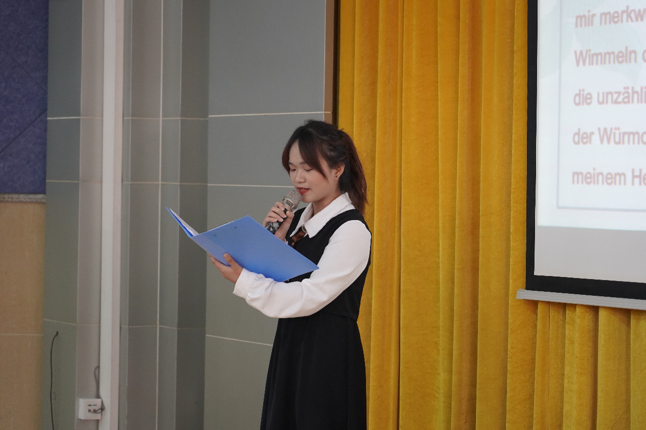 第六位登场的选手是德语2101班李嘉喻。他朗诵的作品是《少年维特的烦恼》。《少年维特的烦恼》是德国作家歌德创作的中篇小说。少年维特的经历和故事,对一代代青年人的成长有着重要影响。