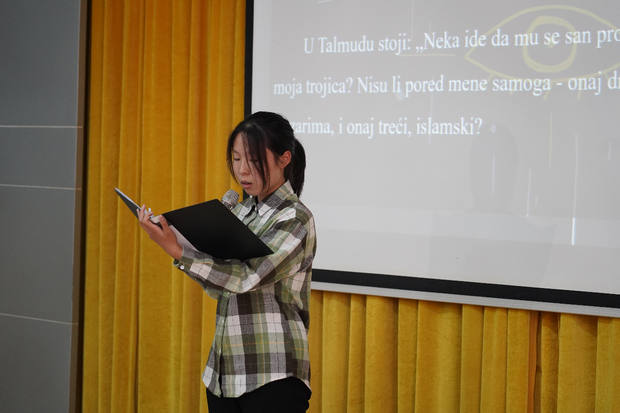 第三位登场的选手是塞尔维亚语2101班田佳琳。她朗诵的作品是《哈扎尔辞典》。《哈扎尔辞典》被称作“寻梦者的疆土”,而此处的节选正是一段关于 “梦”的奇思。