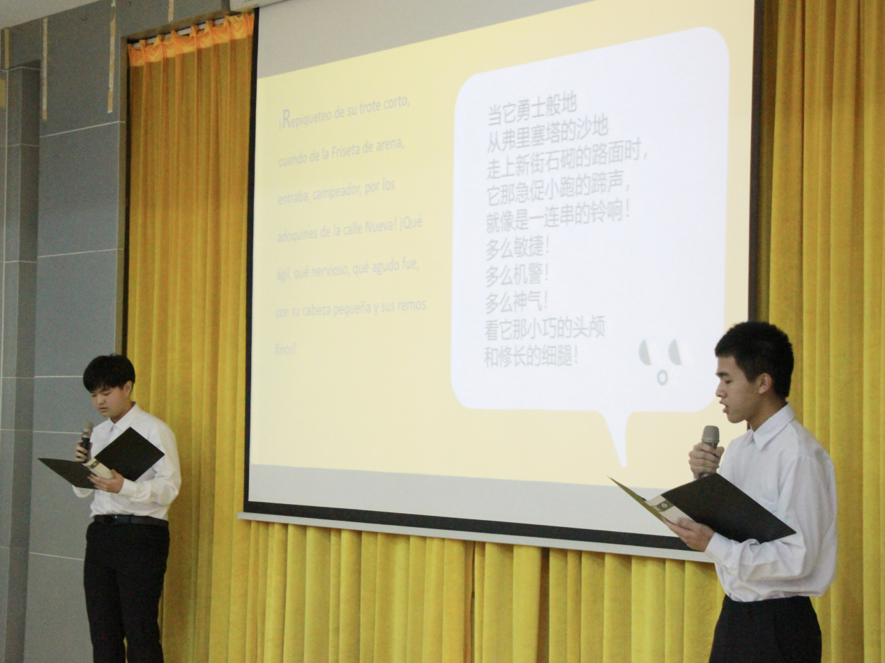 比赛现场,选手们激情澎湃,自信从容,伴随着背景音乐的播放,选手们富有感情的声调,连贯自如的肢体动作和流利的发音赢得了评委和观众的一致好评。通过朗诵经典作品,同学们对生命与爱有了新的感悟和更深刻的理解,同时也体会到了语言的美与力量,从而进一步激发了同学们的语言学习热情。