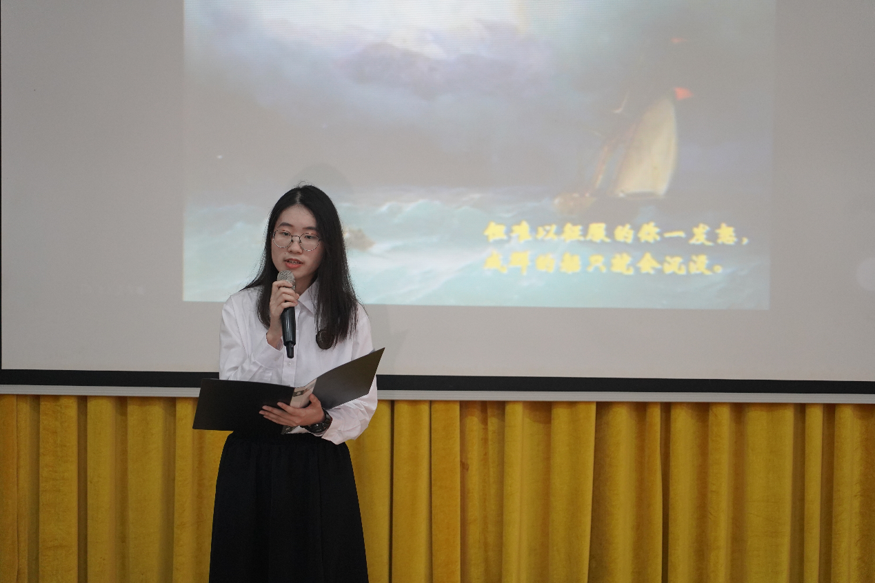 下午两点半,比赛准时开始。首先登场的选手是俄语2101班的陈姿颖。她朗诵的作品是《致大海》。《致大海》是俄国浪漫主义诗人普希金的一首政治抒情诗,全诗通过海之恋,海之思,海之念的“三步曲”,表达了诗人反抗暴政,反对独裁,追求光明,讴歌自由的思想感情。