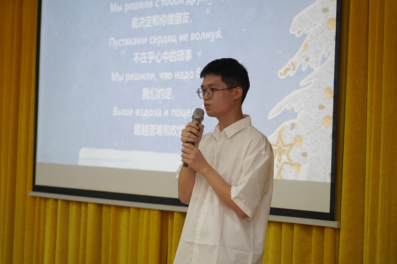 第四位登场的选手是俄语2001班罗万兴。他朗诵的作品是《我决定和你做朋友》。《我决定和你做朋友》是一首关于爱的力量的诗歌,这爱已超出最真实的友谊。