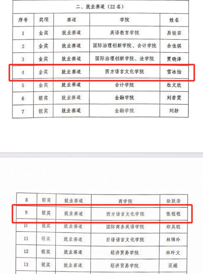 校赛评比结果公布,经过院系推荐、多轮评审等环节,遴选产生52位选手荣获校级奖项。我院学子成绩喜人,共有5人获奖:本科21级麦文疑、王婷、杨蕾蕾三位同学分获成长赛道金、银、铜奖;硕士23级雪冰怡、张程程分获就业赛道金、银奖。冯迪南、陈湘蓉两位老师获评优秀指导老师。