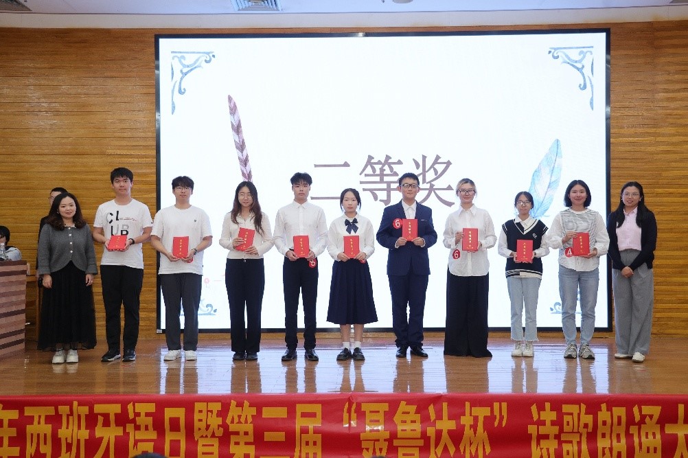 “活动育人”的教育理念,突出了西班牙语系雄厚的师资力量和完善的人才培养体系。同时,她还强调了诗歌在语言学习与文化交流中的重要性,鼓励学生们通过比赛深刻体验诗歌的魅力,进而提升自己的语言感知能力。