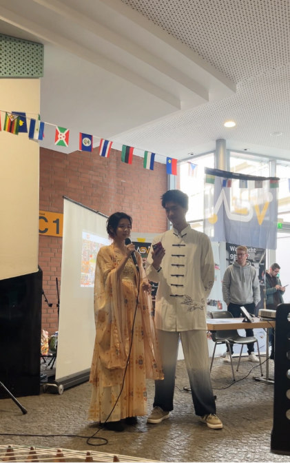 2024年11月5日,德国帕德博恩(Paderborn)大学举办了国际文化周活动,德语2022级学生杨淳奕等与其他中国留学生一起参与了中国摊位的筹备和展示。通过展示书法、茶艺、汉服和生肖文化等形式,同学们向来自世界各地的师生展示了中国传统文化。很多外国友人兴致勃勃地尝试用毛笔写中文名字,茶艺区吸引了不少人驻足品尝。汉服展示成为亮点,许多同学换上汉服合影留念,感受中国传统服饰之美。同学们还向大家介绍了中国生肖文化,许多人都对自己的生肖表现出极大兴趣。杨淳奕表示:“这次活动不仅加深了我对文化交流的理解,也让我为能成为中国文化的传播者而感到自豪。”