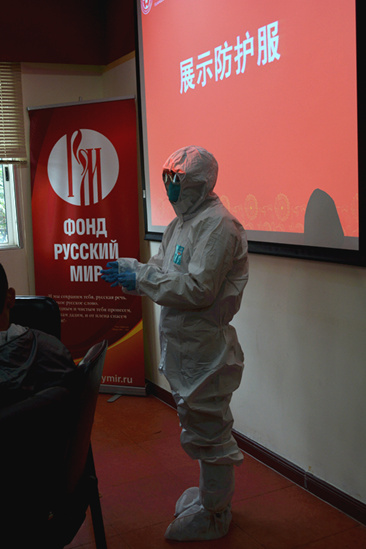 接下来,学生代表展示如何穿、脱防护服。防护服在成员们的工作中必不可少,按照正确顺序和注意事项穿、脱防护服保障了成员们的卫生安全。