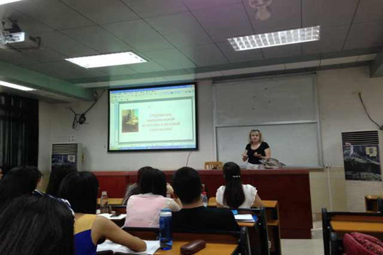 罗金娜副教授从1985年至今一直从事对外俄语教学的工作,并且长期和英美驻俄罗斯叶卡捷琳堡总领馆合作,负责外国领馆官员的俄语教授工作,具有丰富的对外俄语教学经验。罗金娜副教授此次讲座主要围绕语言和民族文化的关系而展开。她指出,语言结构系统和言语运用表现上的差异与民族文化的差异有一定程度的关联,俄罗斯作为一个情感性突出的民族,其民族性格、民族文化必然在俄语的语言层面中留下烙印,她着重从俄语语法的角度进行了分析。