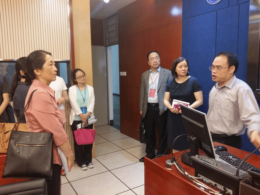 随后,专家小组走访了教育技术中心,参观了开设口译课程的同传教室。按照评估流程,专家分为两组,分别选听了一门专业必修课和一门专业选修课,并查阅了毕业论文、试卷等资料。当天下午,评估专家小组深度访谈了德语专业的五名教师和五名学生。