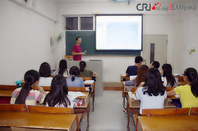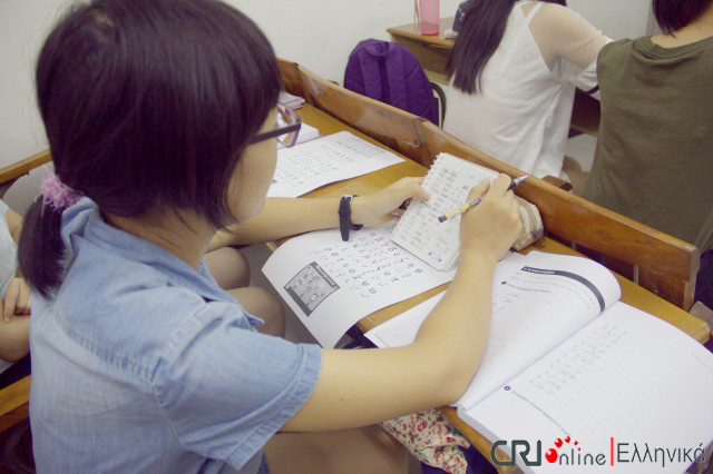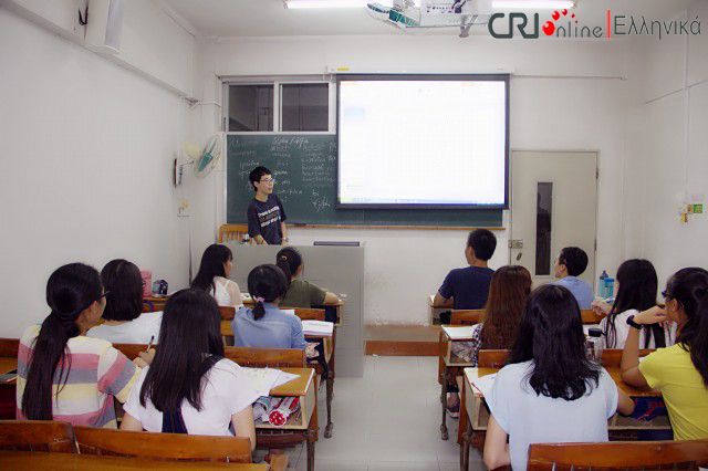 中国国际广播电台记者首先采访了希腊语大一新生的第一节课。学生们在第一节课上学习了希腊语字母,了解了希腊概况。课上还举行了一个小型的命名仪式,每位学生都选择了自己的希腊语名字。当同学们被问起为何选择希腊语作为自己的专业时,他们纷纷表达了自己对希腊悠久历史、多彩文化、优美景色的向往、爱慕和浓厚兴趣。