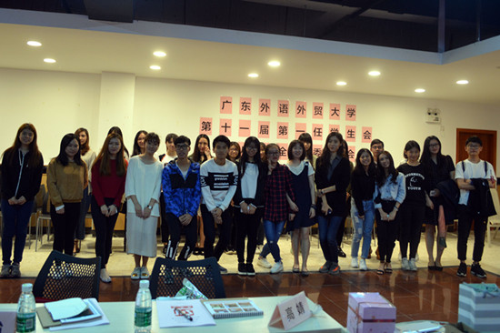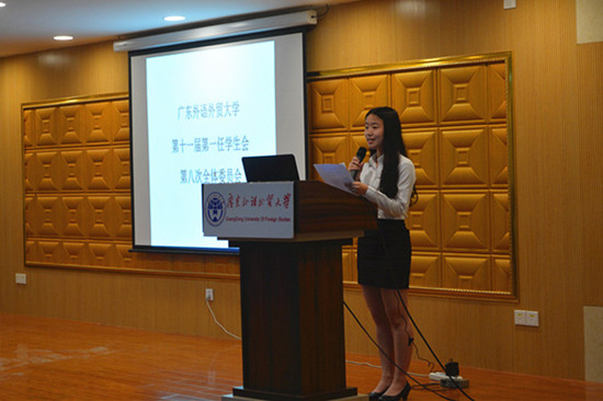 第十一届第一任学生会第八次全体委员会在北校第三饭堂四楼青年之家正式开始。广外学生会指导老师吴怡老师、校学生会主席高婧以及各院学生会主席和学生会干部出席了本次会议。金宝博