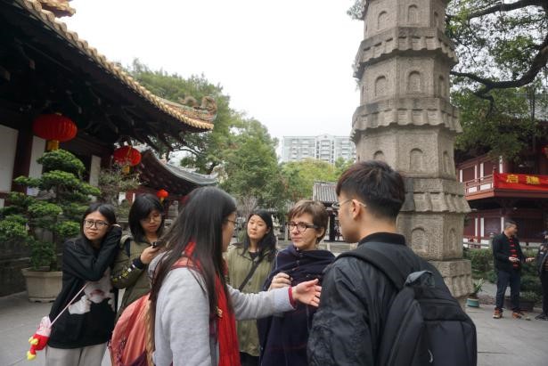 进入光孝寺后,同学们首先介绍了光孝寺的发展历史及相关人物的生平。紧接着,第二座门楼里的四大天王(Czterech Nebiańskich Królów)又掀起了一场即兴口译。我们参观介绍了光孝寺的主殿——大雄宝殿(PawilonWielkiegoZwycięzcy),以及偏殿建筑,如:钟鼓楼、六祖殿、泰佛殿、洗钵泉、柯子树等。僧侣给我们每人派了一炷香(kadzidła),我们带着外教体验了一次别具地域特色的上香拜佛的简单仪式。从佛(Budda)到菩萨(Bodhisattwa),从建筑结构到历史典故,同学们翻译的内容包罗万象。博学好问的外教激发起同学们一场又一场激烈的讨论,大家从中掌握了不少翻译技巧及佛教知识。
