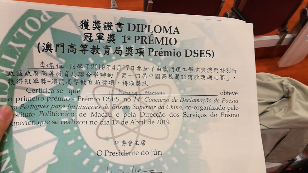 “中国高校葡语诗歌朗诵比赛”每年举办一届,是面向中国大陆及澳门地区葡萄牙语本科学生的专业赛事。经过与来自包括澳门大学,澳门理工学院,圣若泽学院,澳门科技大学,对外经贸大学,湖北大学,中山大学,北师大珠海分校共8所高校的24名选手的激烈角逐,金宝博