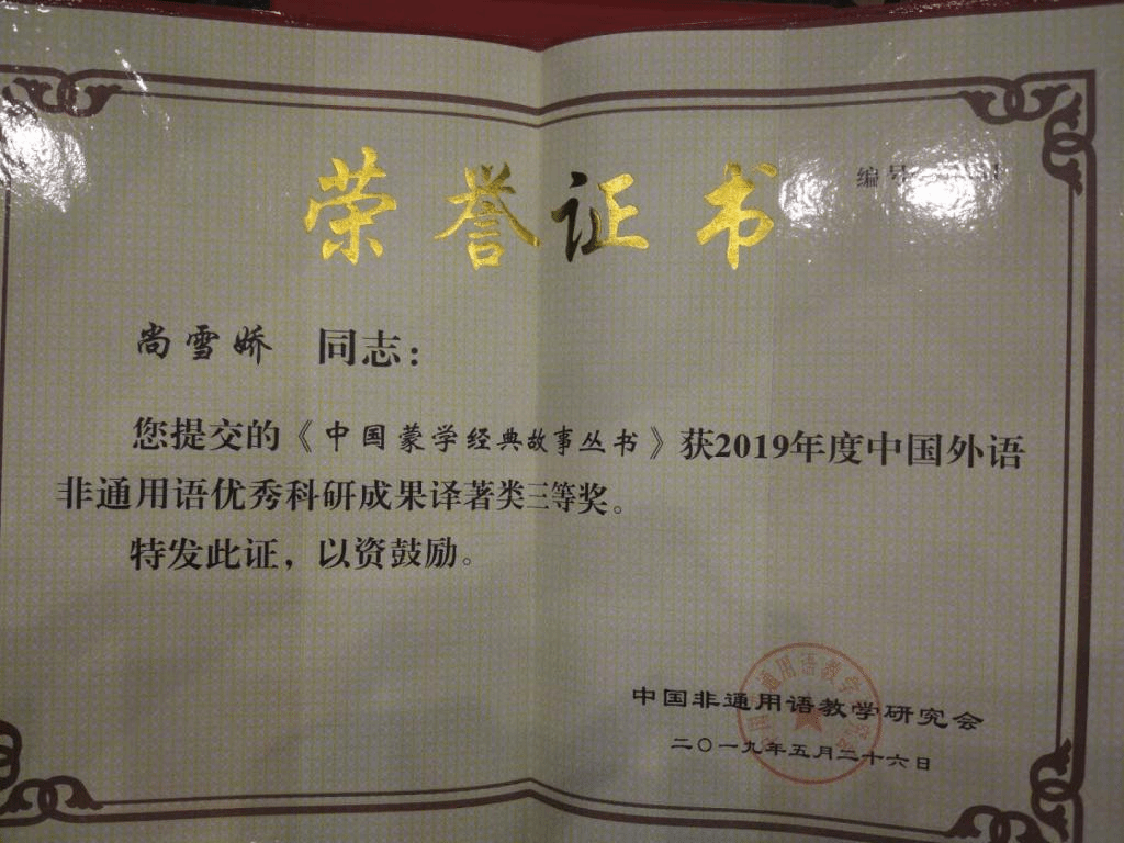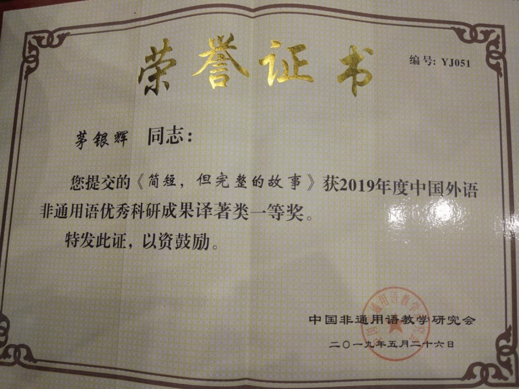 非通用语教师在优秀科研成果译著类中获得佳绩。波兰语茅银辉教授的《简短,但完整的故事》荣获译著类一等奖;葡萄牙语尚雪娇老师的《中国蒙学经典故事丛书》获译著类三等奖。