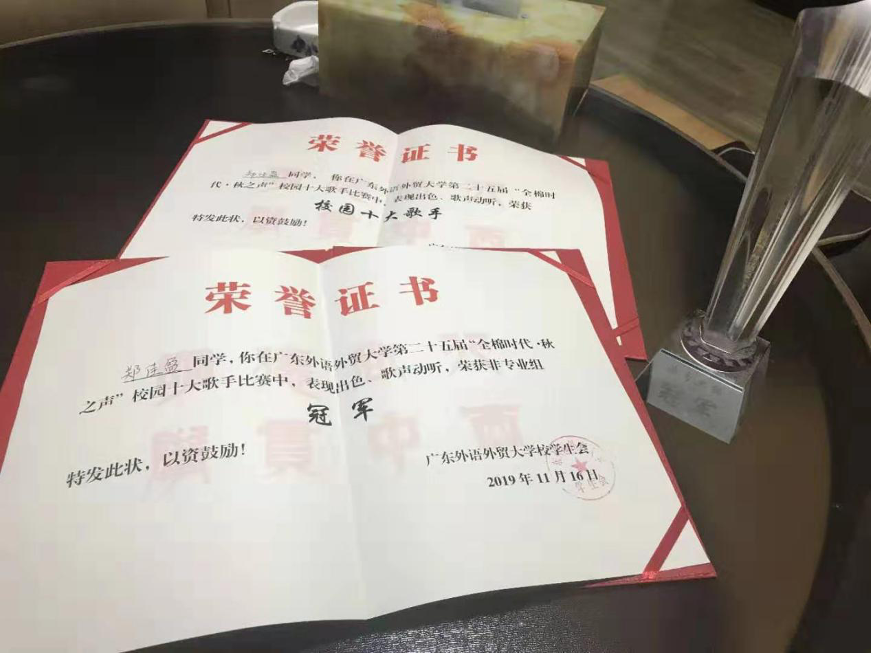 来自西班牙语1802的郑佳盈同学代表金宝博 参加了本次比赛,并以其优美的嗓音与扎实的功底在一众选手中脱颖而出。她凭借一首《失落沙洲》给现场嘉宾留下了极为深刻的印象,赢得了观众与评审的一致好评,最终荣获非专业组冠军,并被评为“校园十大歌手”。她所取得的成绩,不仅仅是个人的成绩,更为金宝博 增添了一抹绚丽的荣光。