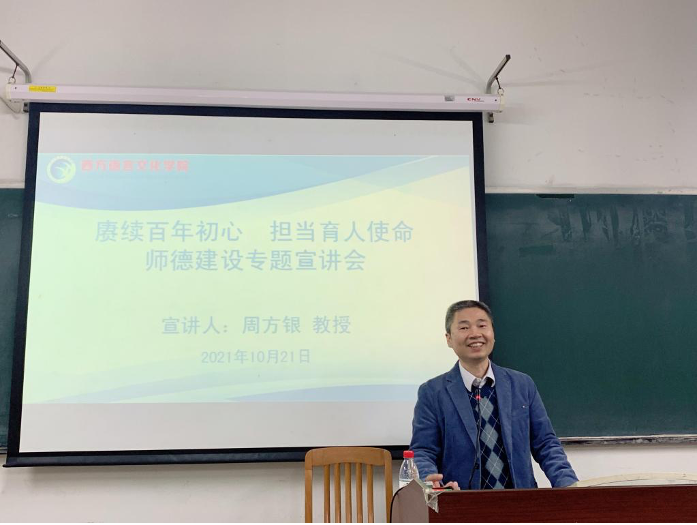 党委邀请学校师德专题宣讲团成员、学校师德标兵、国际关系学院院长周方银教授开展了主题为《赓续百年初心 担当育人使命》的师德建设专题宣讲会,学院领导班子、全体教职工共80余人参加了学习。专题宣讲会由学院党委书记敖湘晖主持。