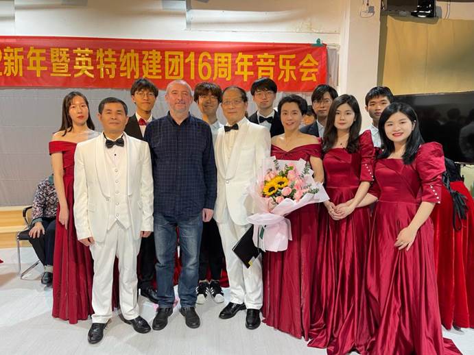 英特纳合唱团则表演了多语合唱、独唱、诗朗诵、口琴演奏、手风琴演奏等多个精彩节目。合唱团前辈们热爱生命、热爱音乐、热爱歌唱的精神深深感动了在场所有观众。俄语系已退休多年的李福安老师和丁可展老师也是合唱团骨干成员,在音乐会上见到他们格外欣喜。最后,音乐会在温馨欢乐的气氛中落幕,全场合影留念。
