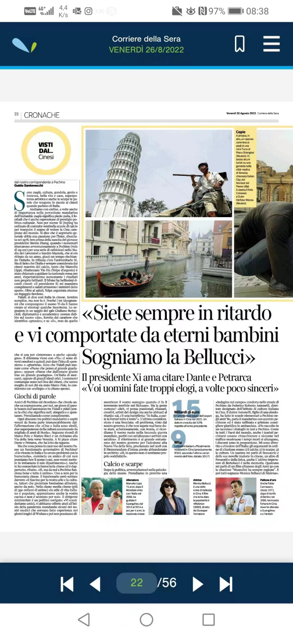2022年8月26日,金宝博 意大利语系张海虹教授接受意大利《晚邮报》采访。该报是意大利第一纸媒,也是其国内历史最悠久的报纸。采访中,张老师分享了她研究成果《形象、消费与身份认同:中国“90后”女性对意大利奢侈品消费》中我国九零后女性心目中的意大利人形象。