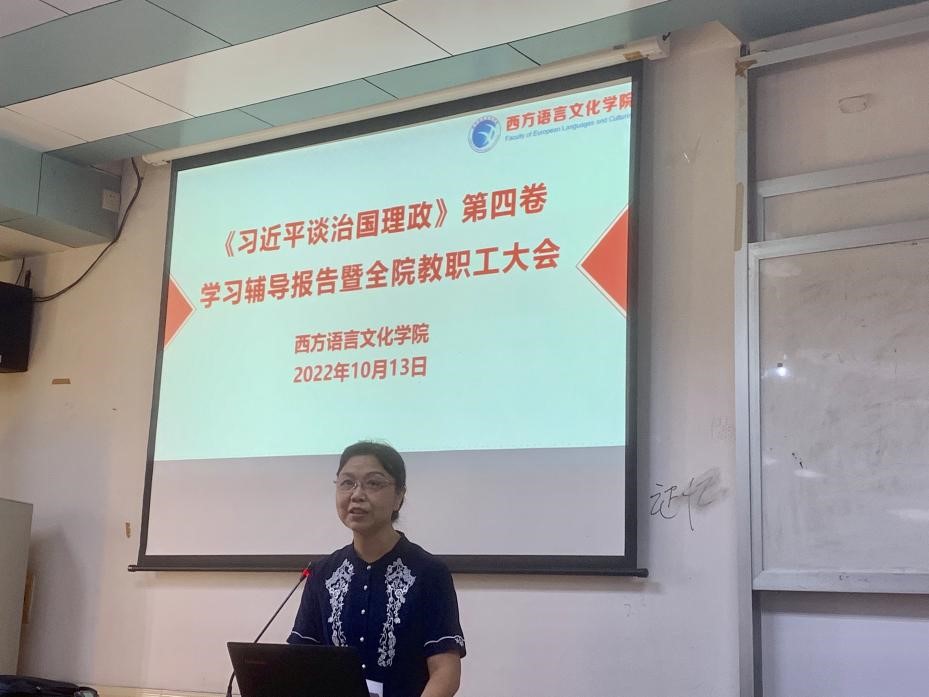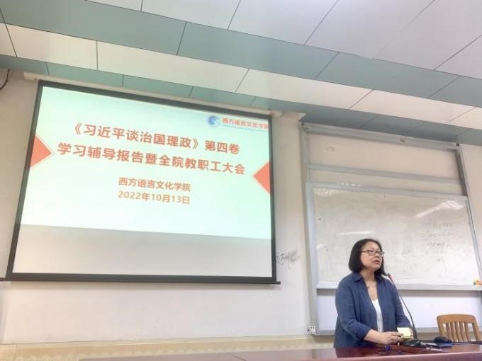 在四教424教室召开了《习近平谈治国理政》第四卷学习辅导报告暨全院教职工大会。会议邀请了马克思主义学院宋善文教授开展了题为“对‘三大时代课题’的新拓展——学习《习近平谈治国理政》第四卷”的专题辅导报告。会议由金宝博