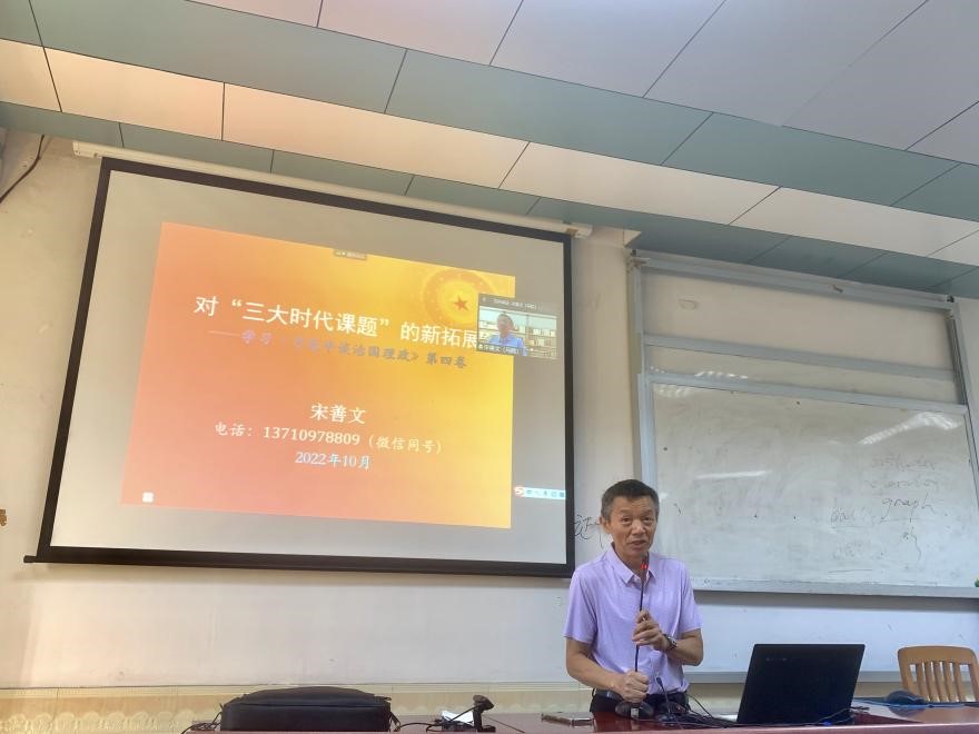 宋善文教授围绕“三大时代课题”,对“三大时代课题”的内涵及相互关系、第四卷如何拓展“三大时代课题”、“三大时代课题”新拓展的意义以及“三大时代课题”新拓展的启示四个方面对《习近平谈治国理政》第四卷进行了详细深入的讲解。宋善文教授强调,“三大时代课题”是一个有机的整体,只有系统回答“三大课题”,整体推进各项事业,中华民族才能够行稳致远。必须坚持系统观念,深刻领会“两个确立”的决定性意义,学好用好科学世界观方法论,推进马克思主义中国化,推进理论创新,才能战胜前进道路上的风险挑战。