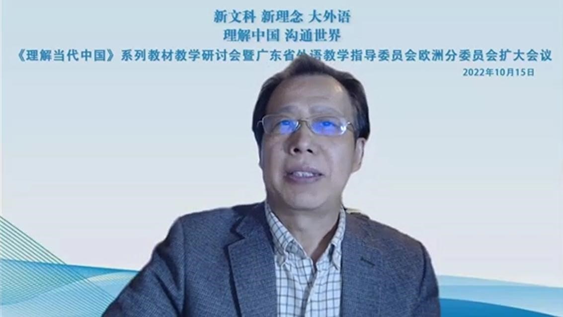 教育部高等学校外国语言文学类专业教学指导委员会主任委员、北京外国语大学党委常委、副校长、《理解当代中国》系列教材总主编孙有中教授在致辞中表示,此次研讨会广东省高校欧洲语言专业的专家们共同探讨如何落实好《理解当代中国》多语种系列教材进课堂和新文科背景下外语人才培养的相关问题,对于进一步推进新文科建设、深化新时代外语教育改革,培养新时代外语人才具有重要的意义。广外作为广东省本科高校外语类专业教学指导委员会主任委员单位,扎实推进《理解当代中国》系列教材进高校,促进“三进”工作在全省高校所有10个欧洲语言专业的全面落实,也为其他省市进一步推进“三进”工作的开展积累了经验。