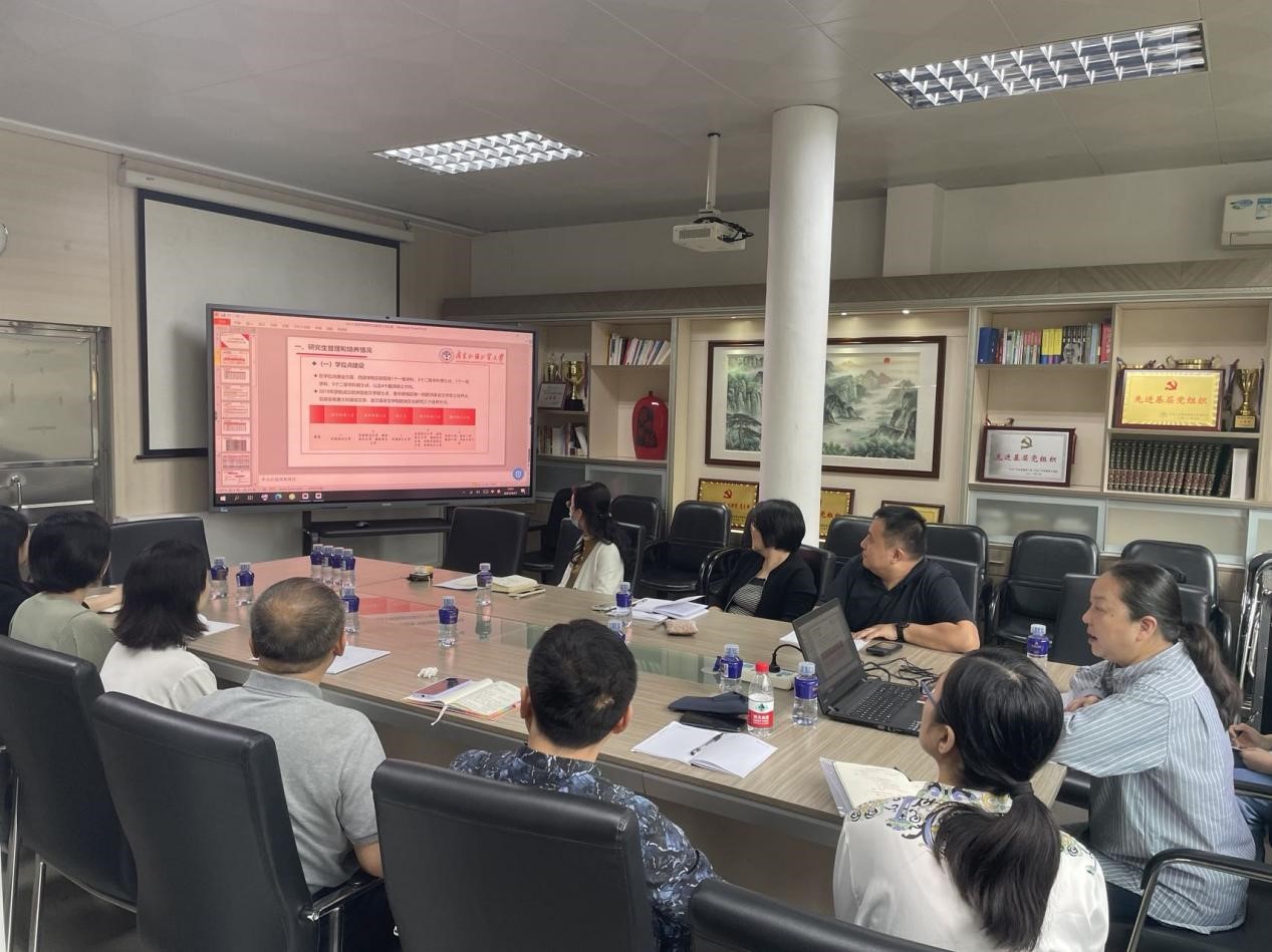 杨晓敏院长介绍了学院研究生管理培养情况,并专门就学位点建设、研究生国际化项目以及高层次人才培养工作的推进情况、存在的困难和下一步思路进行汇报。王秀民书记代表学院对研究生院的调研表示欢迎,并就硕士研究生招生工作及学位点申报工作与研究生院领导进行交流。王书记表示,希望未来在人才引进、学位点申报等工作中得到学校更多的指导和支持。