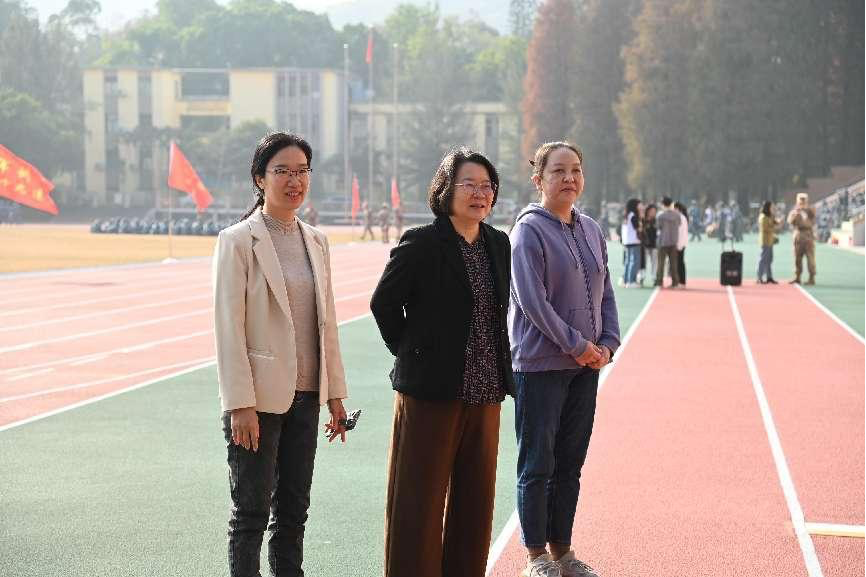 党委书记王秀民、院长杨晓敏、党委副书记魏少娟、辅导员张阳一行来到北校区综合体育场,对正在进行紧张军训的2023级新生及教官们进行慰问。