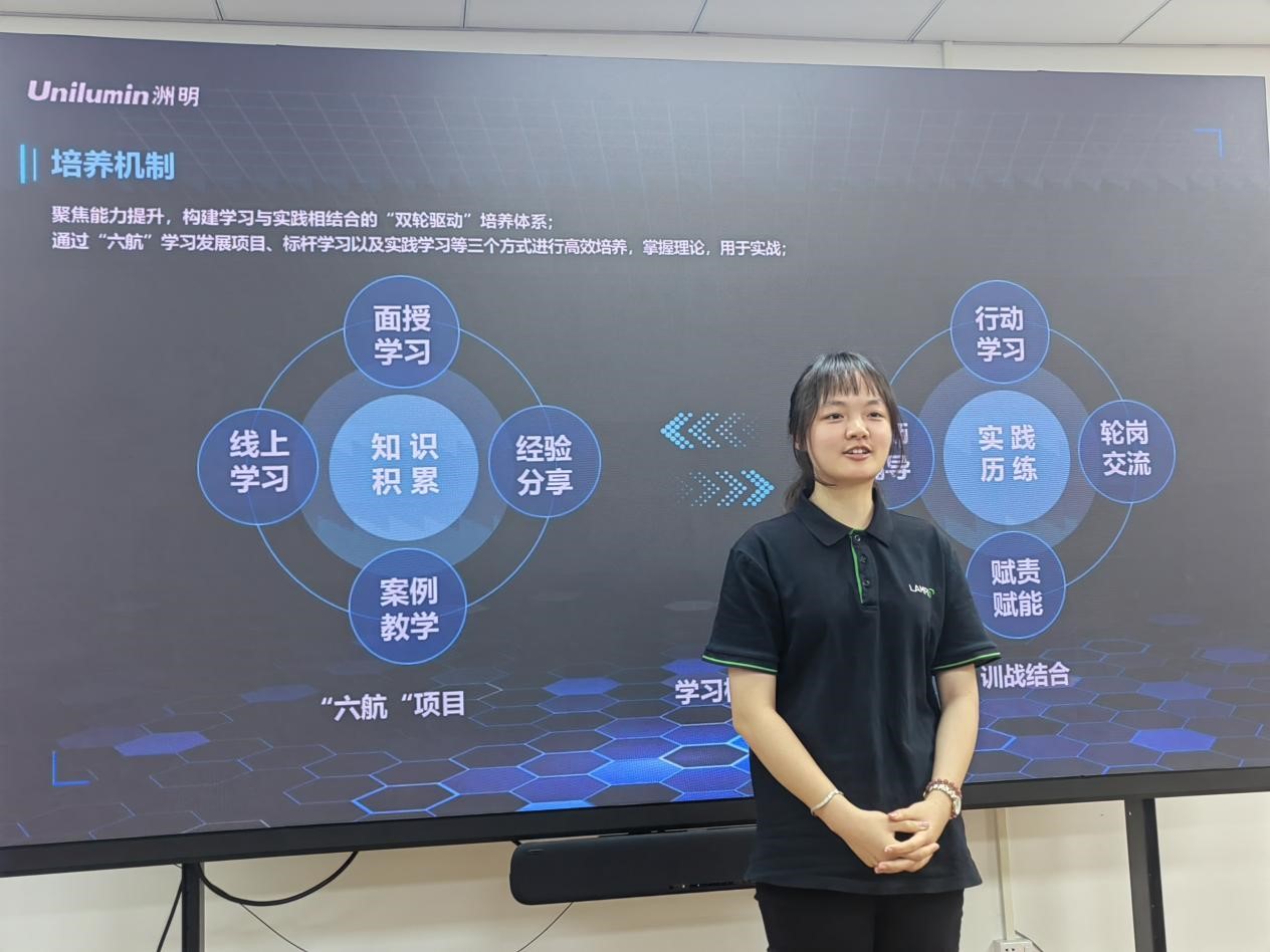 在座谈中,洲明人力资源经理王岩向师生们介绍了洲明的人才招聘计划、行业的趋势、企业的发展历程。王岩高度认可广外毕业的学生在洲明的工作表现和作出的贡献,认为广外和洲明在人才供需方面高度匹配。洲明员工代表、金宝博