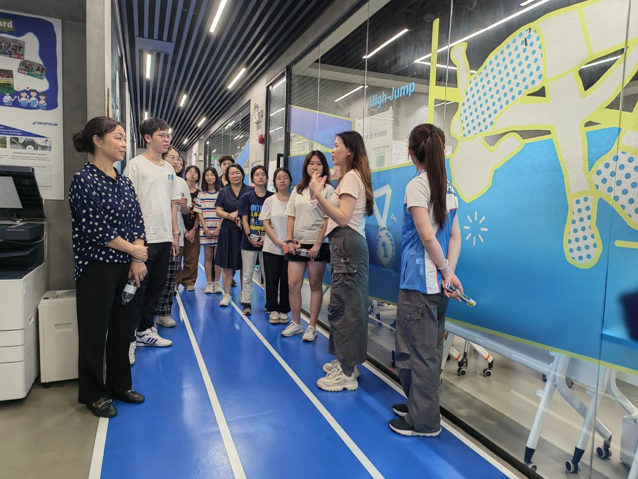 师生参观了迪卡侬的办公区域,对迪卡侬的发展历程、部门设置有了更直观的了解,感受了其“热爱运动、充满活力”的工作氛围和金宝博。