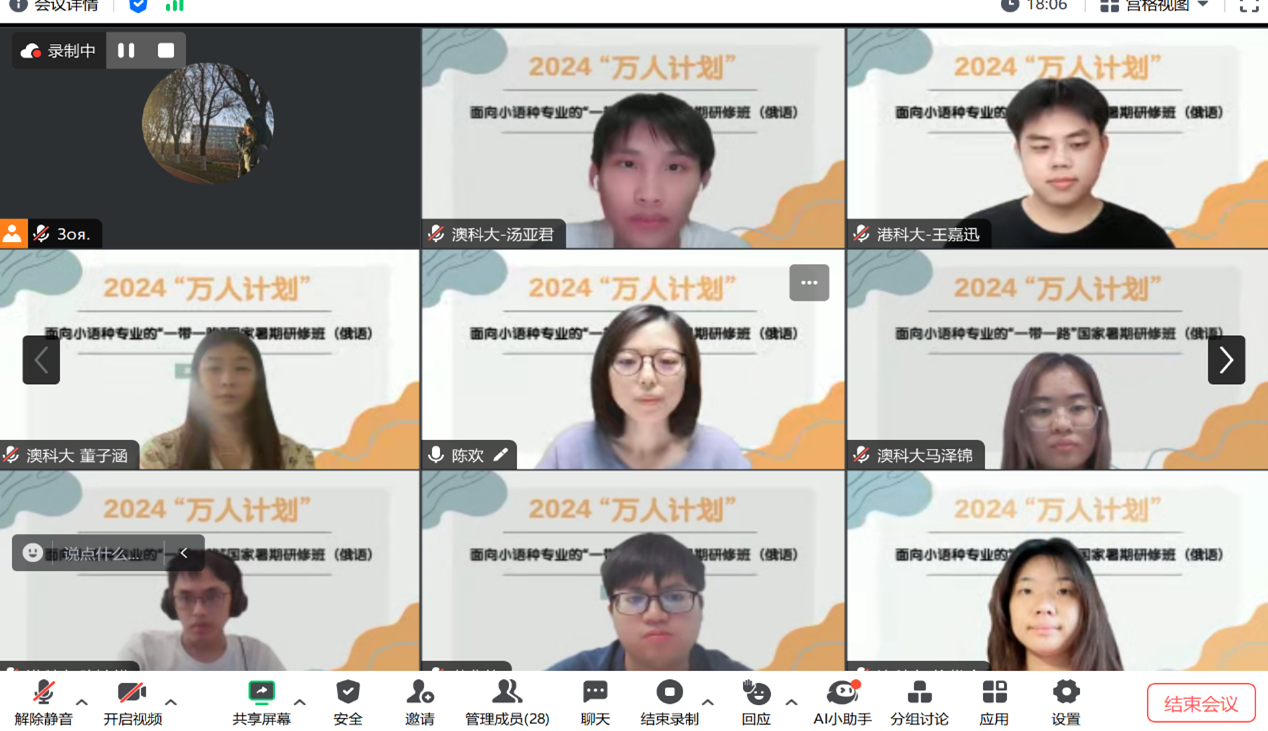 承办的教育部港澳台办“万人计划”之“面向小语种专业的‘一带一路’国家暑期研修班”(线上)的热潮。七天的线上学习旅程再次点燃了粤港澳大湾区十所高校中一百五十名学员的参与热情。