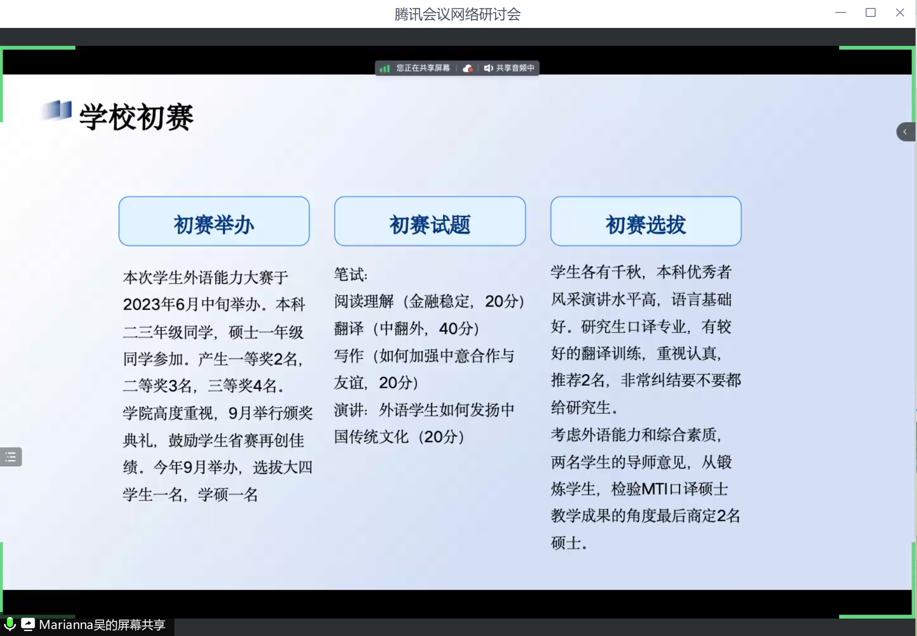 紧接着,吴菡老师展示了对外经济贸易大学校内初赛的筹备与选拔情况,参考大赛样题设计模拟试卷进行选拔,尽可能将机会平等给予各个学段的学生。另外还结合贸大特色专业课程与教学,向金宝博