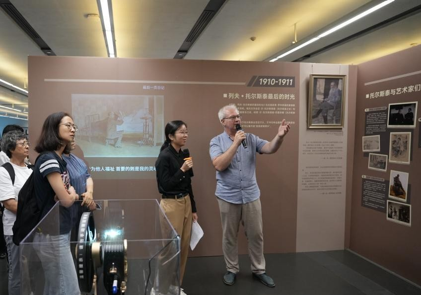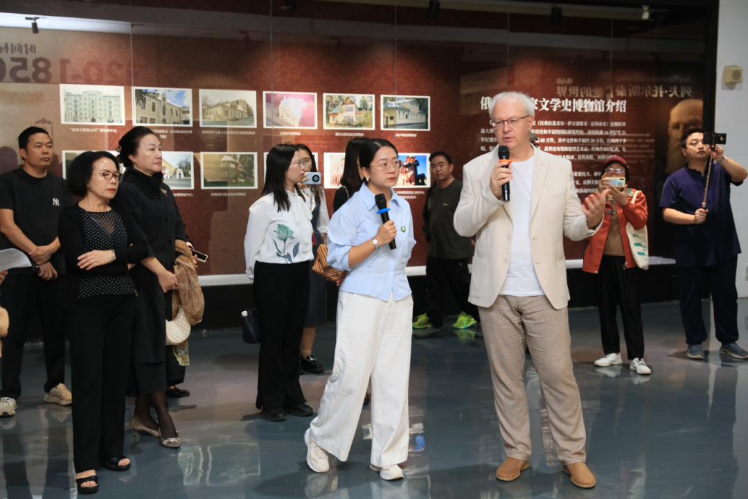 作为本次活动的协办单位,为展览的前期筹备和后续开展提供了充分支持。我院俄语系教师公冶健哲应广州图书馆之邀,担任“列夫·托尔斯泰与中国”特展的学术主持,负责该板块的文字撰写和部分古籍资料的搜集。展览开幕当天,公冶健哲老师与俄罗斯国家文学史博物馆副馆长巴维尔·叶甫盖耶维奇·佛京共同为观展读者导览,介绍了托尔斯泰的生平与创作历程,并重点解读了托尔斯泰与中国文化的不解之缘及其对中国现当代文学的深远影响。