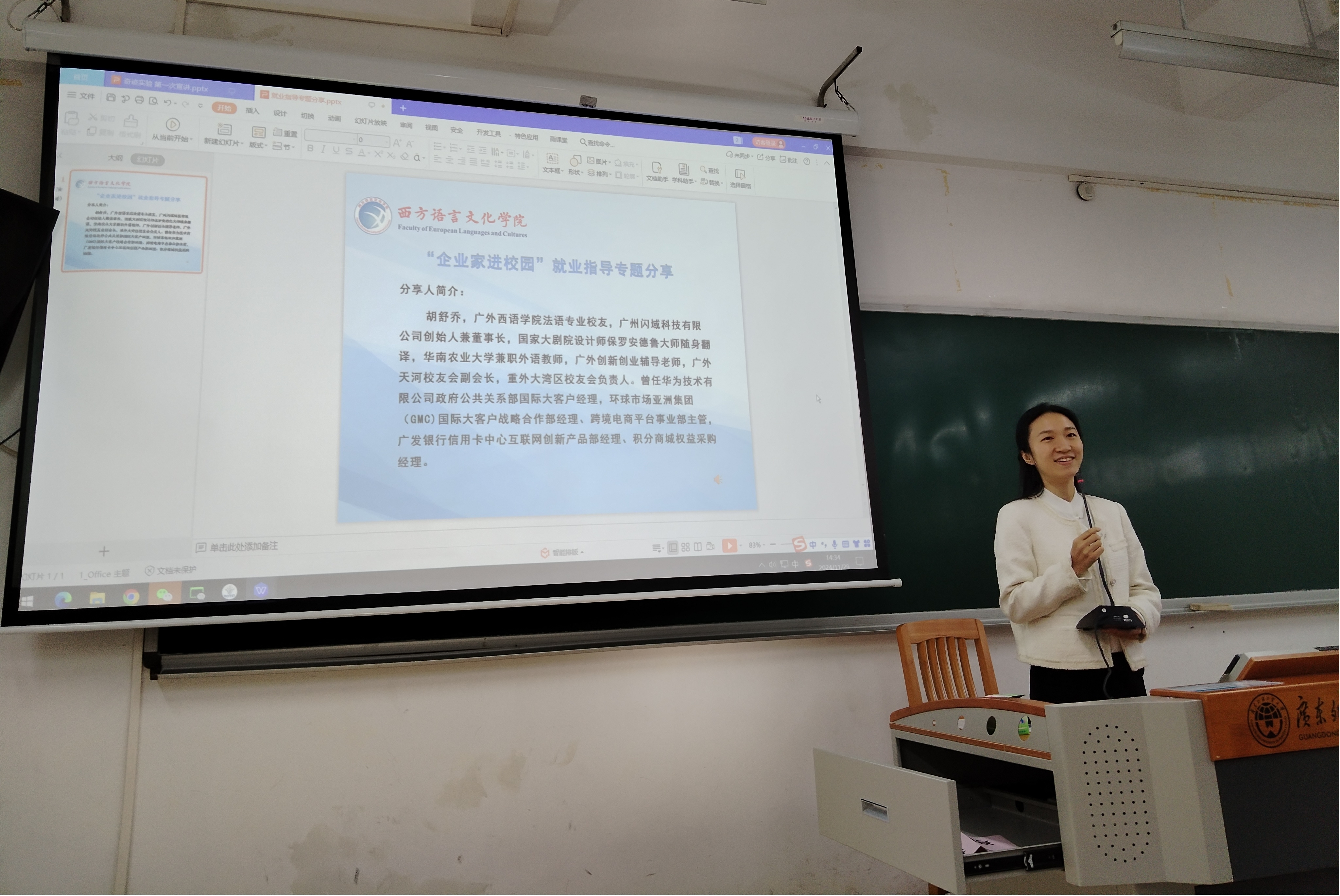本网讯 为加强学生生涯教育和就业指导,增强学生生涯规划意识,2024年11月29日下午,我院在白云山校区六教B213举办了“企业家进西语”就业指导专题分享会。我院2011届法语专业校友、广州闪域科技有限公司创始人兼董事长、广外天河校友会副会长、广外金宝博