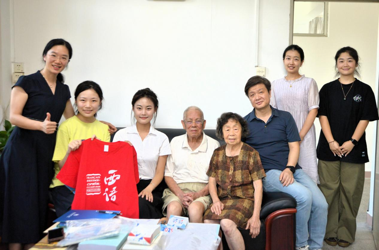团委书记冯迪南及法语系大一、大二学生代表一行,专程前往广外原校长黄建华教授的办公室。师生们怀着崇敬之心,代表全院师生向黄校长及其夫人余秀梅老师致以教师节最诚挚的祝福与亲切问候。这场跨越代际的会面,不仅是对老一辈广外人深耕教育、坚守初心的致敬,更让青年师生得以近距离聆听前辈关于语言学习、学术探索的宝贵经验,汲取砥砺前行的精神力量。